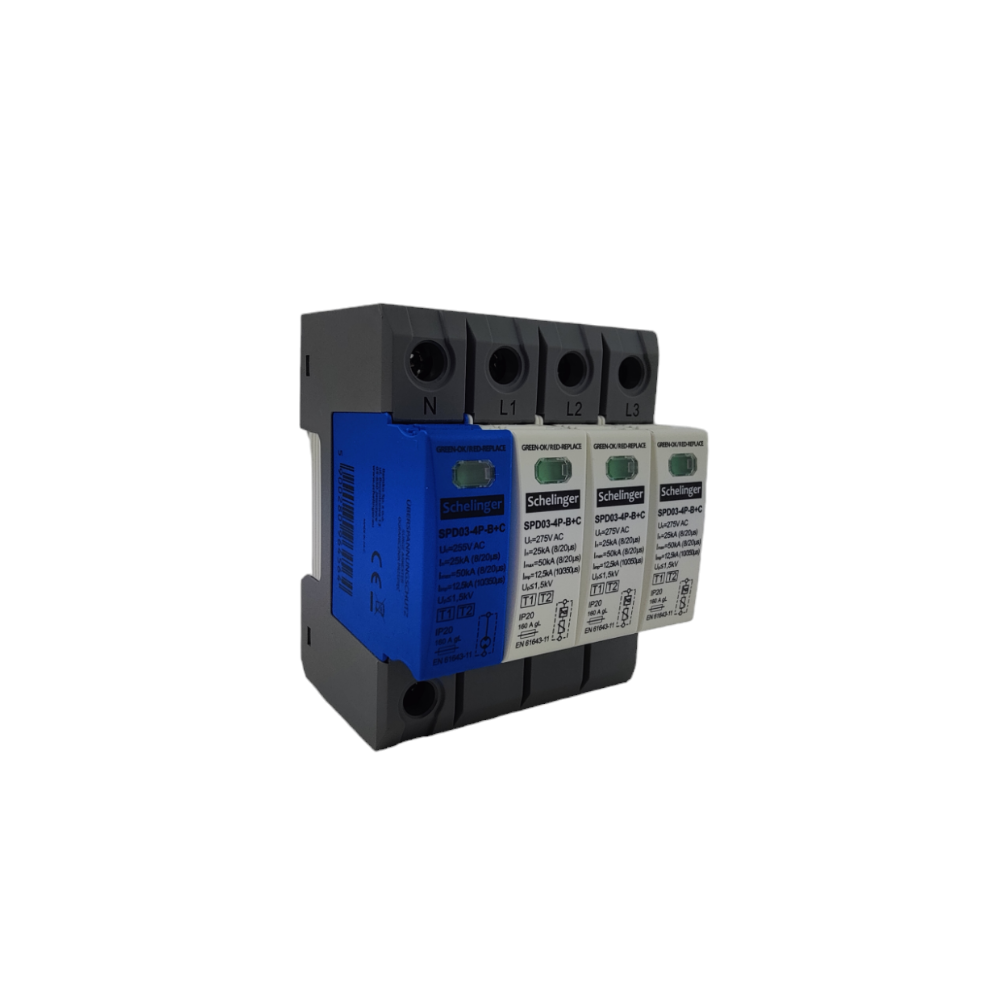 Überspannungsschutzgerät der Marke Schelinger zum Schutz elektrischer Installationen vor Überspannungen. Das Gerät erfüllt die Anforderungen der Klasse T1+T2 (B+C) und bietet umfassenden Schutz sowohl im industriellen als auch im häuslichen Bereich.