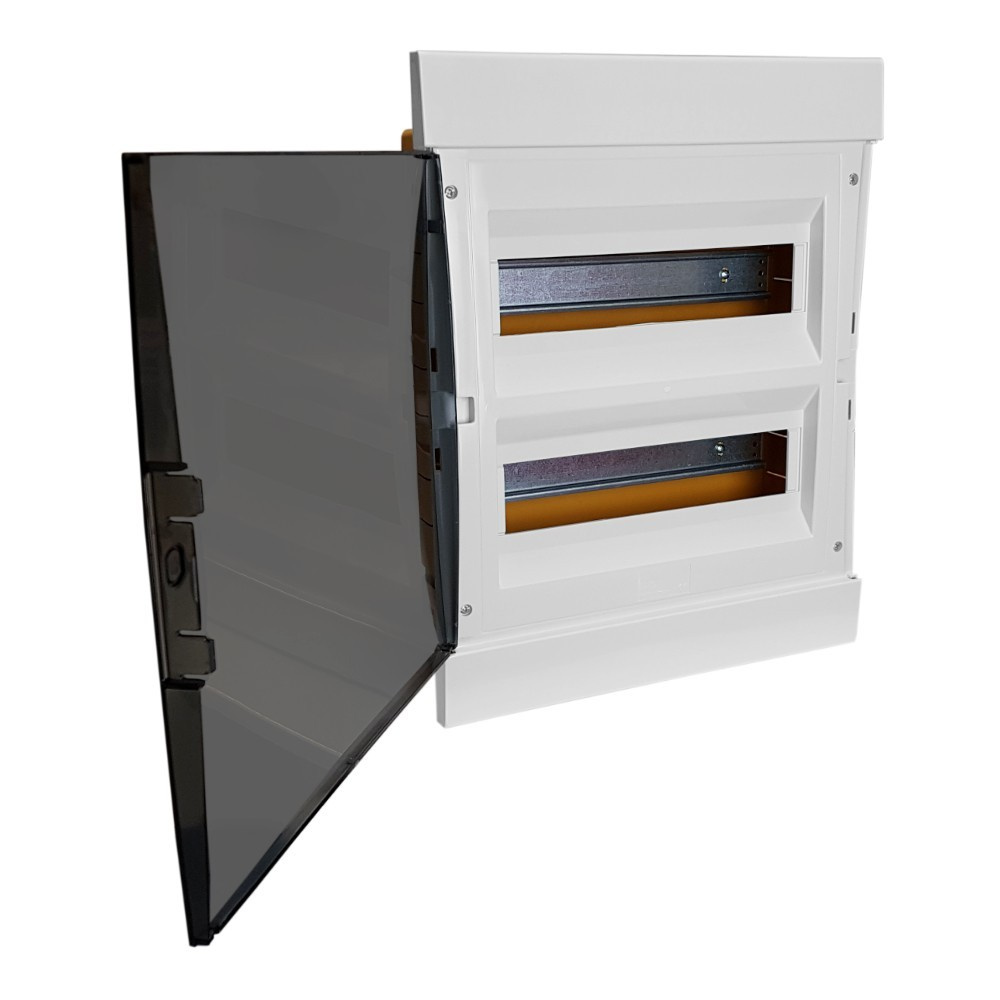 Die Verteilerkasten der Serie 970 bieten Montagelösungen von 4 bis 36 Modulen. Die Modelle sind mit gedimmten oder weißen Türen erhältlich. Die Unterverteilung ist ästhetisch ansprechend und passt perfekt in das moderne Interieur. Das DIN-Schienen-Montagesystem ermöglicht die Montage an der Ober- oder Unterseite der Sicherungskasten. Die Frontplatte besteht aus wärmebeständigen Technopolymeren. Die Tür ist aus strapazierfähigem, farbigem Polycarbonat gefertigt. Gelber (RAL 1017) Basis aus schlagfestem Technopolymer.