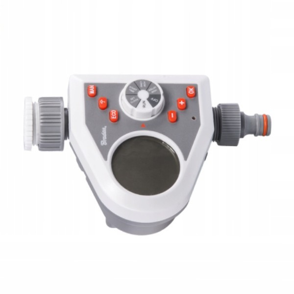 Elektronischer Controller, der für die Steuerung der Arbeit von Sprinklern verantwortlich ist. Der Automat hat eine Betriebsdauer von 240 Minuten und verfügt über sechs Tasten und einen Drehknopf, mit denen Sie die Einstellungen und die Programmierzeit eingeben können. Informationen werden dank des eingebauten LCD-Displays angezeigt. Alle elektronischen Bauteile sind dicht im Gehäuse versiegelt. Das Programmiergerät benötigt zum Betrieb zwei AA-Batterien. Das Gerät informiert Sie über einen niedrigen Batteriestand.