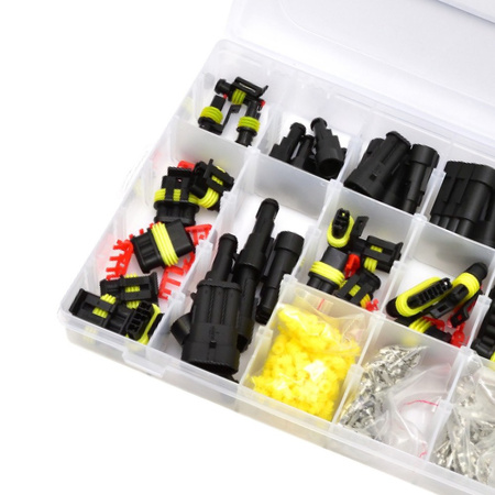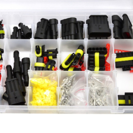 ➡️ Ein Satz von 424 hermetischen elektrischen Steckverbindern in 6 Größen für die gängigsten Kabeldurchmesser. Die Anschlüsse sind mit einem Gummischutz versehen, um sie vor Öl, Kraftstoff oder anderen Flüssigkeiten zu schützen. Sie bieten eine sehr gute Isolierung und Dichtheit. Wird in der Automobilindustrie verwendet, unter anderem für Sensoren und Geräte in Autos.