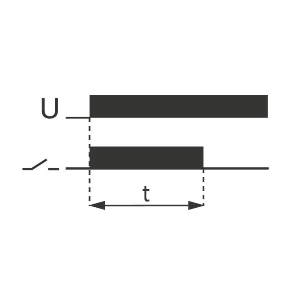 Betriebsmodus: Abschaltung mit Verzögerung Bis zum Einschalten bleibt der Schaltkontakt des Relais in Position 11-10. Nach dem Anlegen der Versorgungsspannung (grüne LED leuchtet) wird der Schaltkontakt in Position 11-12 geschaltet und die eingestellte Betriebszeit läuft ab (rote LED leuchtet). Nachdem die Zeit abgelaufen ist, kehrt der Schaltkontakt zu Position 11-10 zurück. Die Wiederinbetriebnahme der Betriebsart des Relais ist möglich, nachdem die Stromversorgung unterbrochen und wieder eingeschaltet wurde..